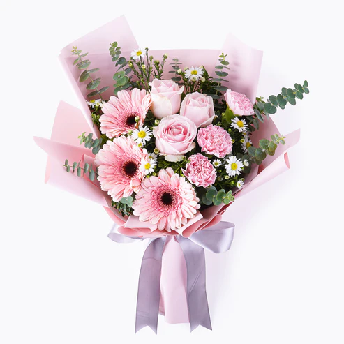 Standard: Light Pink Carnation (3 stalks), Light Pink Rose (3 stalks), Light Pink Gerbera (3 stalks), Eucalyptus Leaves, and White Aster (2 Stalks).
